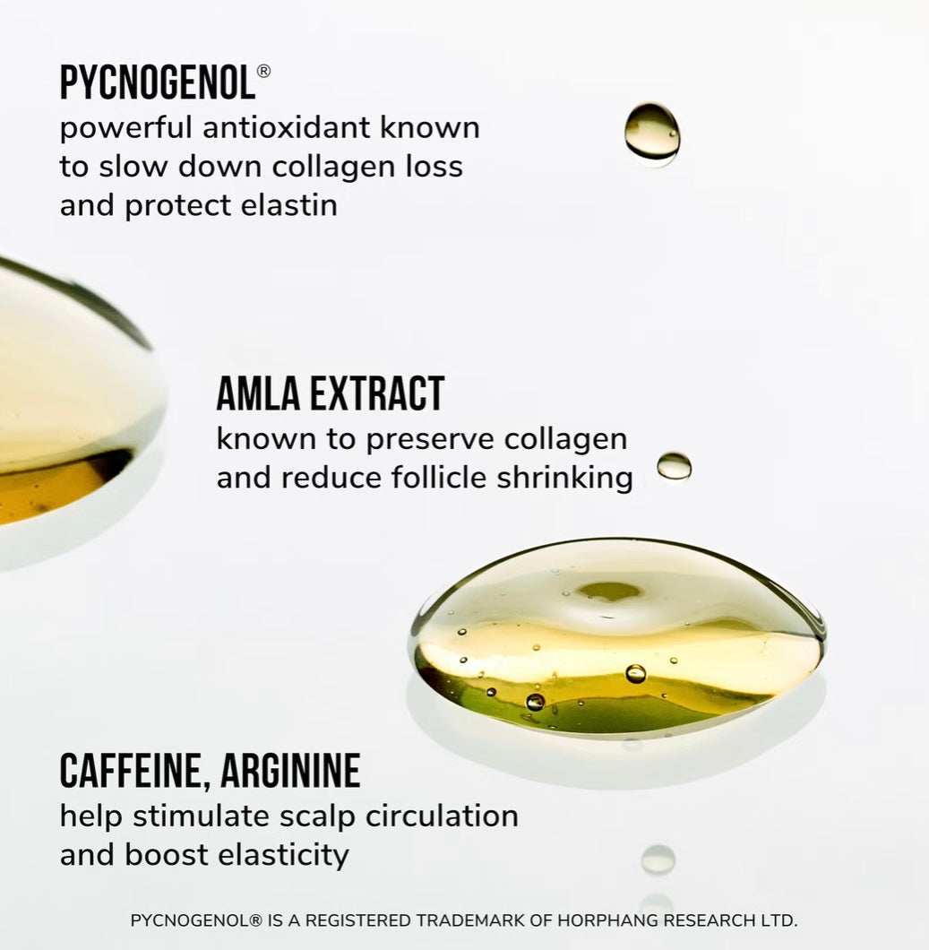 Synthetic Collagen, Procapil®, Pycnogenol® (pine bark extract), Amla, Caffeine, Arginine, Panthenol, Hydrolyzed Rice Protein, Niacinamide, and Seaweed Extract.